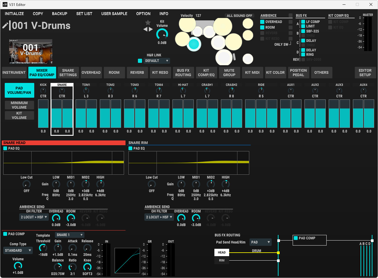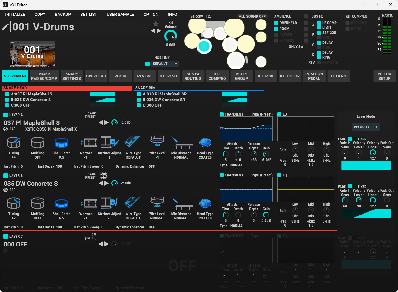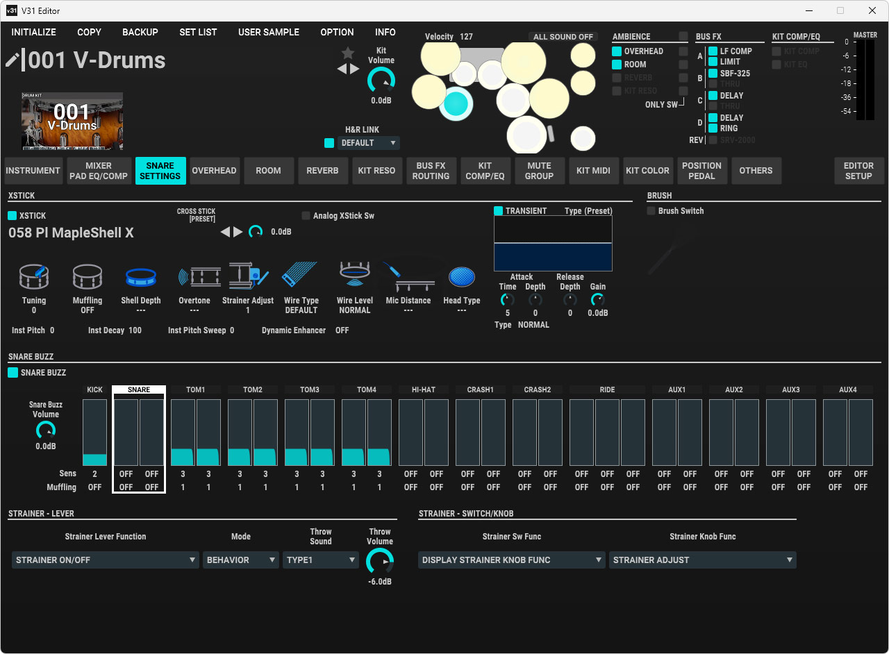 L'édition des sons est déjà très simple depuis l'interface intuitive du module V31. Mais le V31 Editor la rend encore plus facile à l'aide d'une souris et d'un clavier sur le large écran de votre ordinateur. Tous les paramètres d'un kit donné y sont affichés de manière graphique et détaillée, des assignations des sons au mixage audio, en passant par le choix des effets et des routages. La navigation sur l'écran est simple grâce à une barre de menu très lisible qui vous permet de passer d'une section à l'autre d'un simple click.