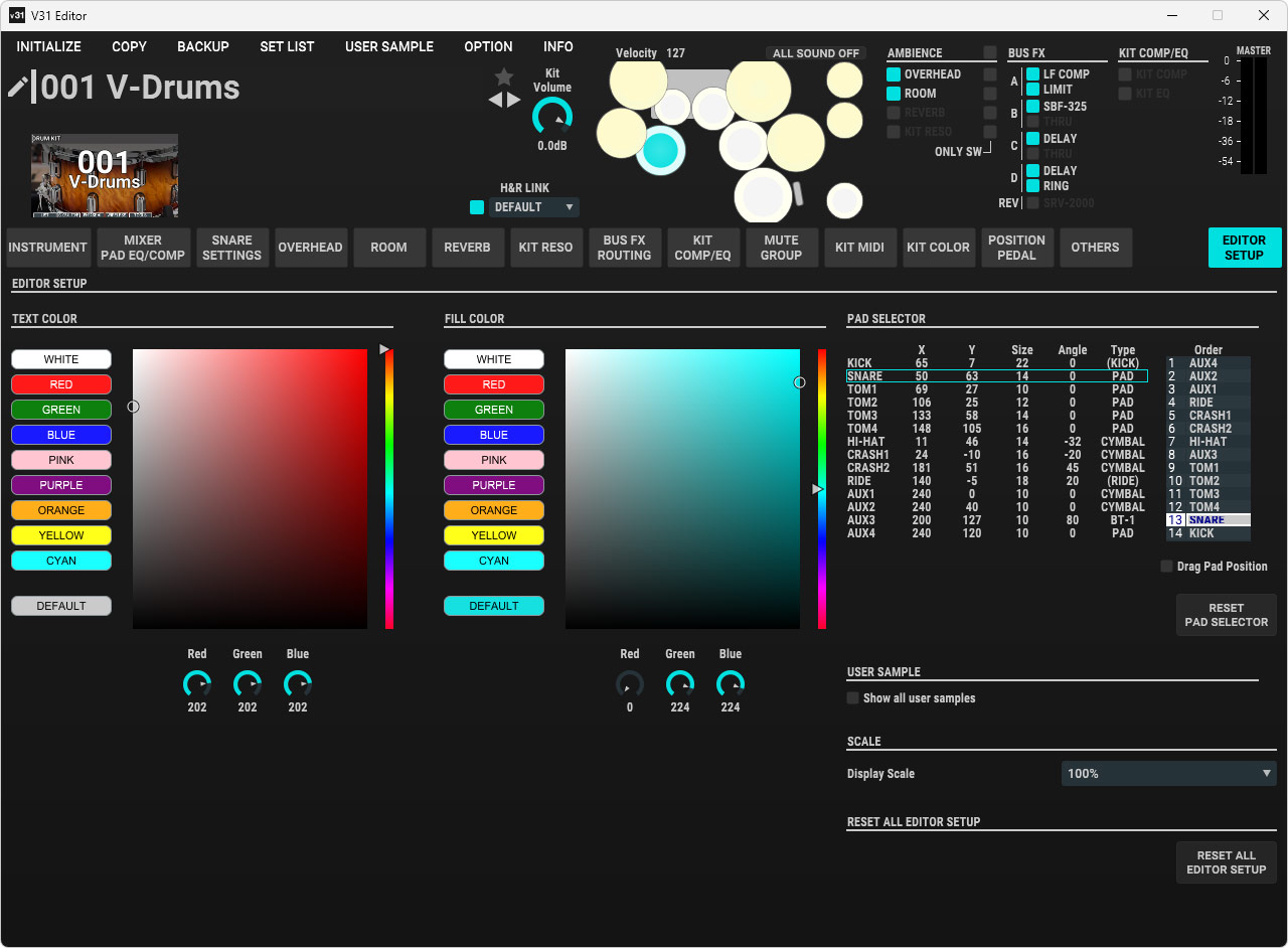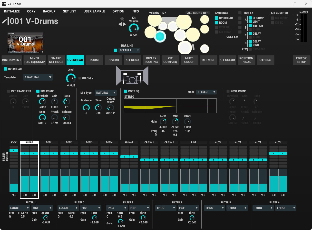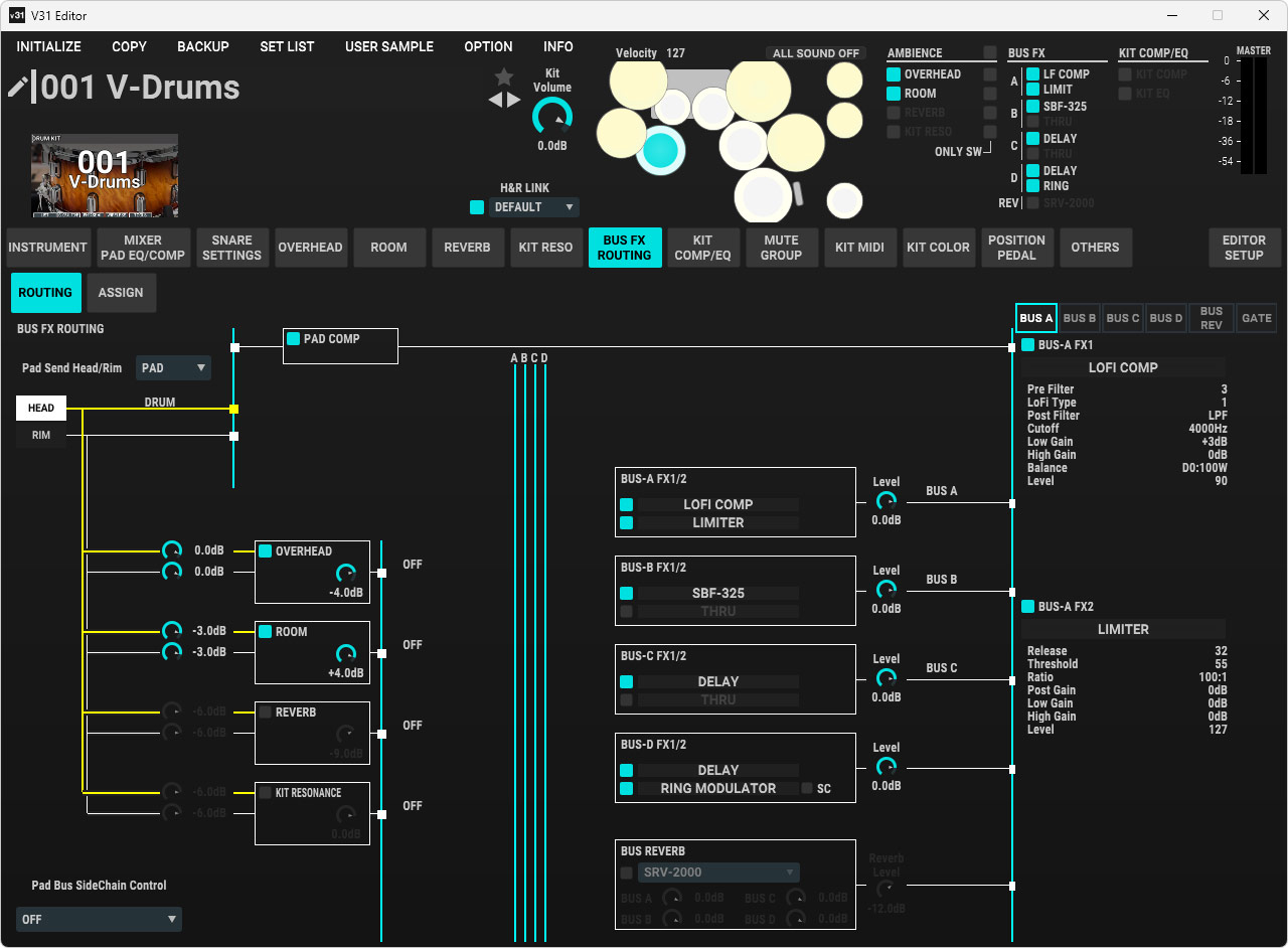 L'édition des sons est déjà très simple depuis l'interface intuitive du module V31. Mais le V31 Editor la rend encore plus facile à l'aide d'une souris et d'un clavier sur le large écran de votre ordinateur. Tous les paramètres d'un kit donné y sont affichés de manière graphique et détaillée, des assignations des sons au mixage audio, en passant par le choix des effets et des routages. La navigation sur l'écran est simple grâce à une barre de menu très lisible qui vous permet de passer d'une section à l'autre d'un simple click.