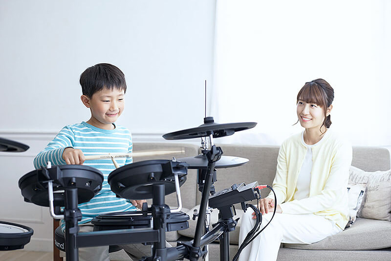 コンパクトでスタンドの高さ調節に対応したVドラムなら、キッズ用ドラムとしても活躍。すべての楽器演奏に必要なリズム感だけでなく、日々の練習を通して集中力も養えます。お母さんも一緒に、家族でドラムを楽しみましょう。