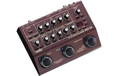 『AD-10』は、ピックアップを搭載したアコースティック・ギターの音を、演奏者自身が簡単に調整して心地よい音色で演奏できるプリアンプです。独自開発した「アコースティック・レゾナンス機能」によりアコースティック・ギター本来のあたたかく奥行きのある響きを、つまみひとつで最適に設定することができます。また、演奏フレーズの音域や強弱に応じて最適に反応し、従来にない自然な効果をもたらすコンプレッサーや、アコースティック・ギターに最適化されたエフェクト、細かな音質調整を行う4バンド・イコライザーなどを使って、こだわりの音づくりを行えます。