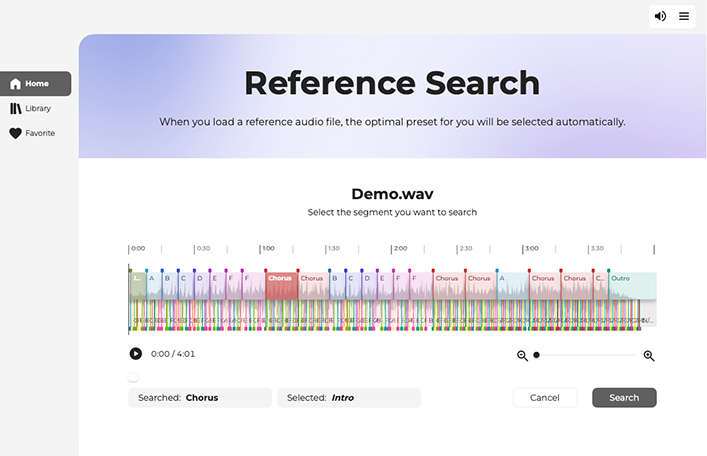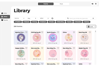 『Melody Flip』には、ソニーCSLの作曲支援の研究に基づく技術が活かされています。その一例として、読み込まれた楽曲から構造、BPM、ビート位置、調、コード進行、ジャンル、ムードといった音楽的特徴を抽出し、その曲に似たお薦めのパレットを表示する機能を備えています。これらの機能には、音楽情報探索(MIR: Music Information Retrieval)分野で培われた研究知見が用いられており、読み込んだ楽曲の構成やキーを視覚的に把握するためのサポートとしても役立ち、制作効率を高めます。