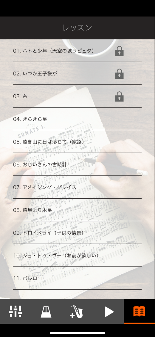 アプリに搭載されている14曲の練習曲(一部有償)は、運指表が表示されるため、譜面を読むなどの音楽知識の必要もなく、簡単に曲をマスターすることができます。練習曲にはガイドメロディーが流れ、再生スピードが速いと感じた場合にはスピードを落として練習する、など自由に再生スピードを変更することが可能です。間違えた箇所はアプリ上に表示され、正しく演奏された箇所が多ければ、点数とともにメダルが進呈されます。全曲のメダルを獲得した後は、スマートフォンやタブレットに入っている憧れの曲にチャレンジしてみましょう。